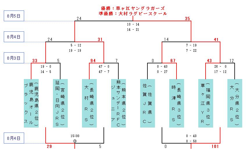 Aグループで優勝〔かしいヤングラガーズ(福岡県)〕および準優勝〔宮崎ラグビースクール(宮崎県)〕したチームは「太陽生命カップ2018第9回全国中学生ラグビーフットボール大会」第2ブロック・スクールの九州代表として出場。